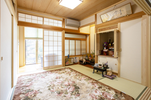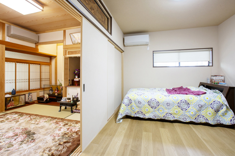 今後、歳をとって車イス生活になっても大丈夫なように、全体的にバリアフリーリフォームを行いました。離れにお住まいの奥様ですが、玄関がなかったため、増築し玄関を設けました。外構にスロープを設置し段差を解消しました。